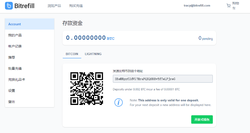 用比特币为账户充值, 您既可以用普通的钱包进行链上的转账,也可以用闪电网络支付。这个教程我们用普通的钱包来做示范。