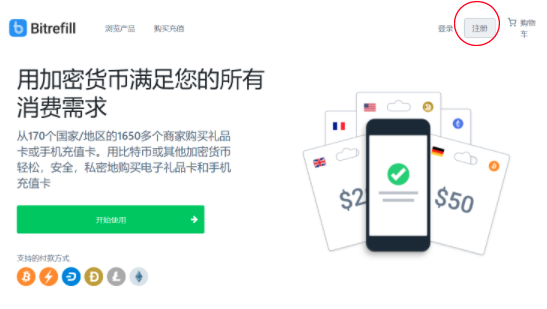 首先登陆 Bitrefill主页,如果没有自动显示中文页面可以在网页的右下角点击‘简体中文’。 然后点击右上角的‘注册’。